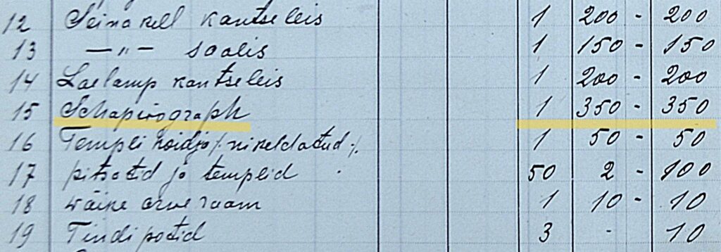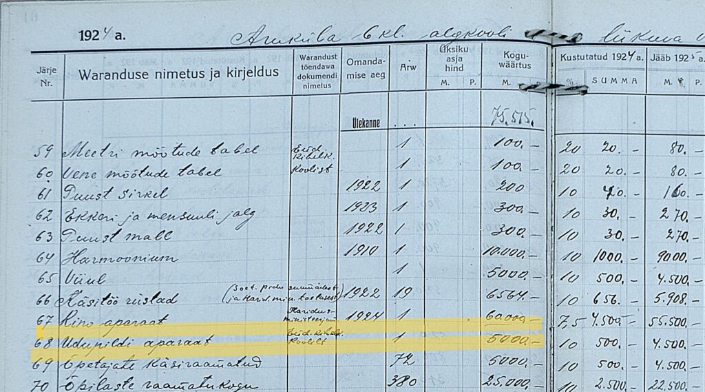Vallamaja varanduste seas on ka 1923. aastal soetatud üllatavalt kallihinnaline portfell (1250 Mrk.-). Mõnesugust imestust tekitab asjaolu, et Rae ja Aruküla koolil oli 1924. a olemas ka “kinoaparaat”. See oli Haridusministeeriumi panus, väärtusega 60 000 marka. Kuna loendis leidub ka “udupiltide aparaat” väärtusega 5000 Mrk.-, siis võib tegu olla tõesti kinofilmide näitamise projektoriga? Kas keegi oskab midagi lisada – selgitada?
