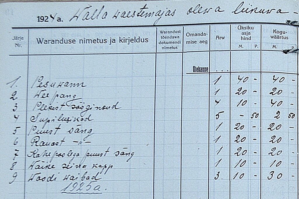Allolevalt ülevaade 1921 – 1926 aastate vallavaradest. Need on kokkuvõtlikud loendid koos varade väärtusega. Toona oli vääringuks Eesti mark, mis ajas oma väärtust kaotas ning inventariraamatutes on seetõttu toimunud “varade üleshindamine” so. hindade vastavusse viimine tegeliku turuväärtusega.
